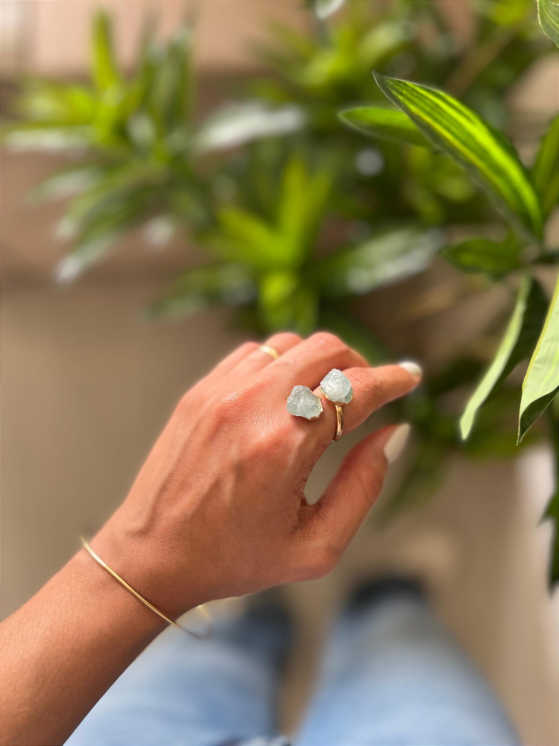 Anel com pedra bruta em Água Marinha, na cor dourado.